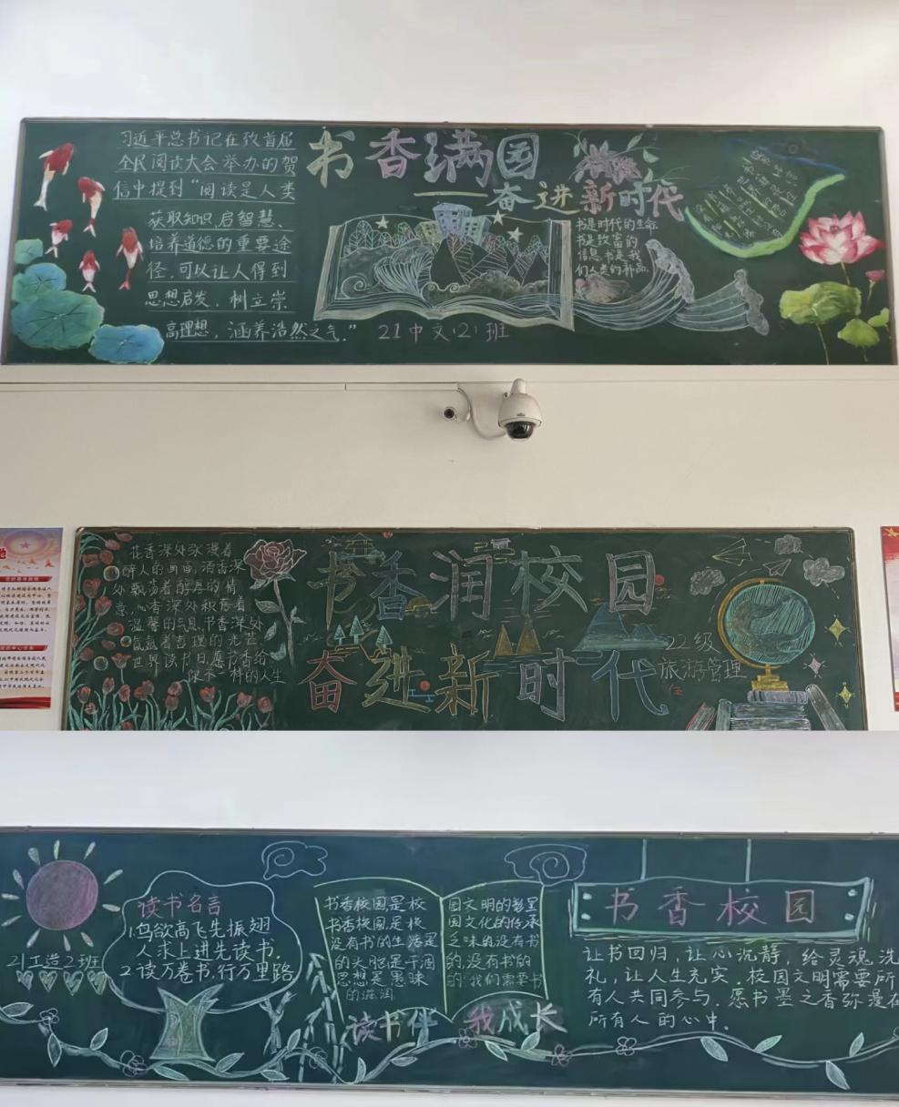 我院各班级紧紧围绕主题对黑板报进行精心的设计,制作出的板报主题鲜明,内容丰富,形式多样。五彩缤纷的图案和大字彰显着书香校园的文化内涵,俊秀的字体显示出学子的文化素养。
