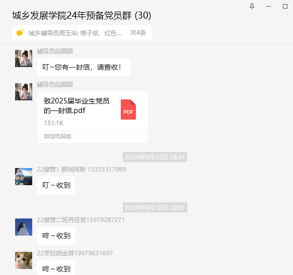 为进一步加强对毕业生党员的关怀与嘱托,精心撰写并落实了 “至毕业生党员一封信” 工作。信件内容围绕党的初心使命、党员责任担当展开,结合毕业生党员即将踏入社会的实际情况,给予了殷切期望与具体指引。信中鼓励27名毕业生党员在新的岗位上继续发挥先锋模范作用,保持对党的忠诚,积极践行社会主义核心价值观,同时提醒他们在面对困难与挑战时坚守底线,不忘党员身份。在发放方式上,通过线上平台将信件推送至每位毕业生党员,使每位毕业生党员都能收到这份特殊的 “毕业礼物”。