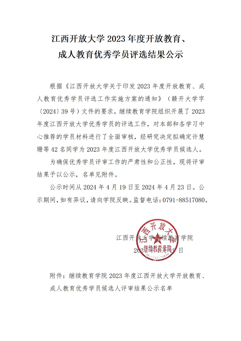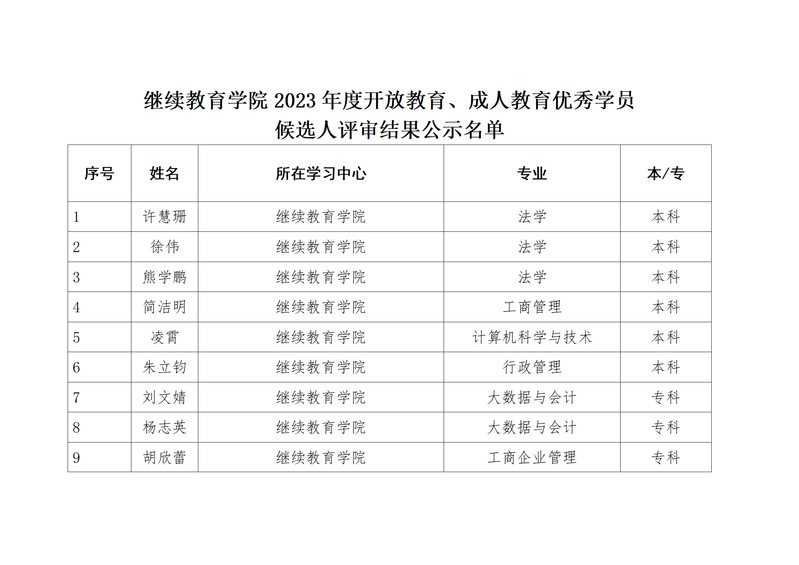 beat365在线唯一官网2023年度开放教育、 成人教育优秀学员评选结果公示