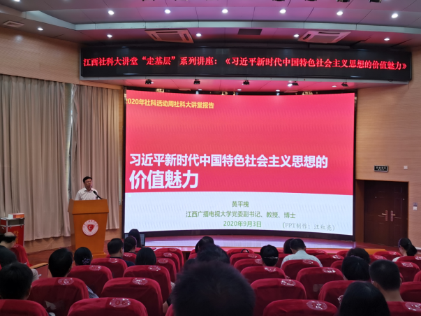 为了贯彻落实理论教育“学思用贯通、知信行统一”的要求,充分发挥理论价值魅力的独特作用,切实提高高校思政课教育教学质量,9月3日上午,江西社科大讲堂“走基层”系列讲座特别邀请beat365党委副书记、教授黄平槐博士,在beat365青山湖校区学术报告厅作了题为《习近平新时代中国特色社会主义思想的价值魅力》的讲座。此次讲座由江西省社会科学界联合会主办,江西广播电视大学承办,学校机关党委和高职学院党委各支部书记、宣传委员,思政课专兼职教师,高职学院专职辅导员,学工处、科研处等相关工作人员80余人聆听了讲座。