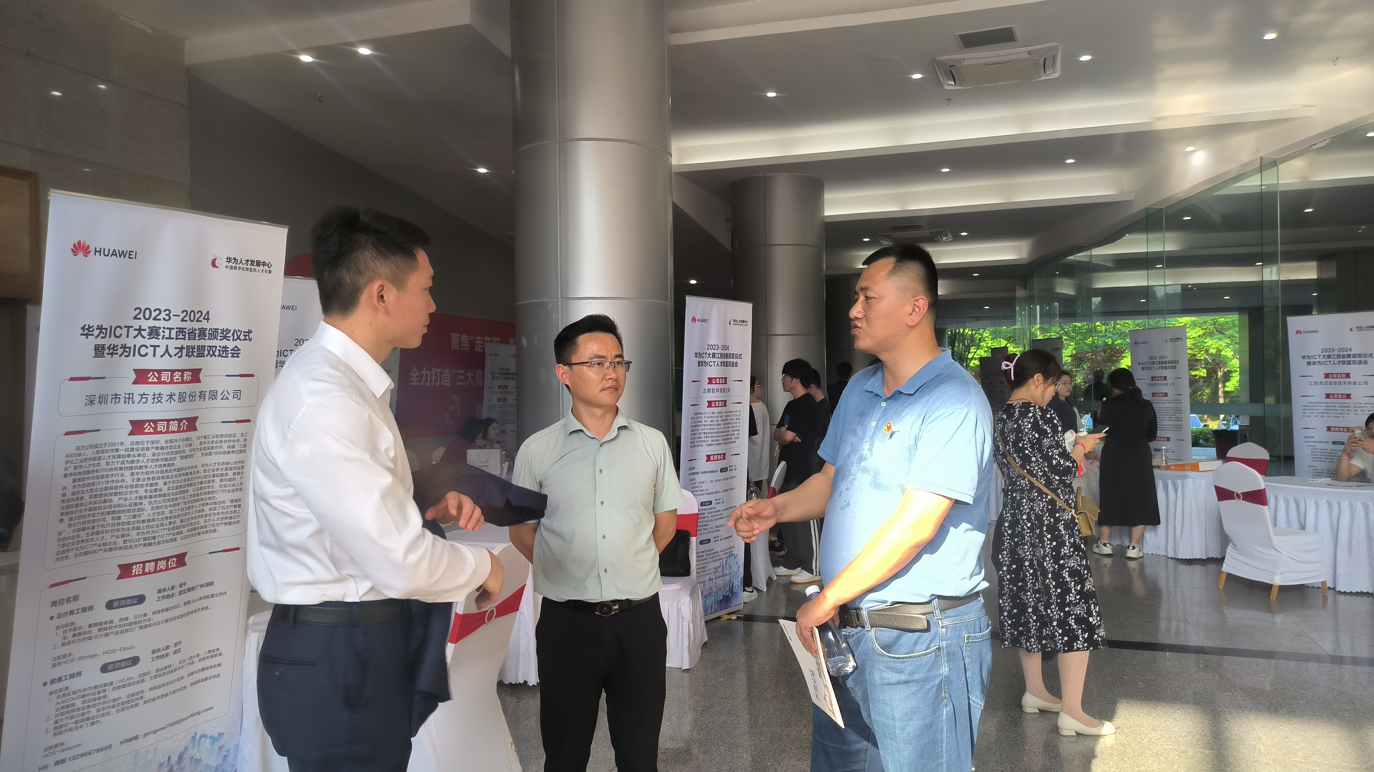 张世麒一行先后前往江西软件职业技术大学,华为公司在南昌大学前湖校区的人才双选会现场,积极与招聘企业负责人和主办院校、企业联系人就人才培养、校企合作、实习就业等工作进行深入交流,学习相关高校在人才培养及校企合作方面的先进经验,进一步深化专业内涵建设,提升人才培养质量,拓宽就业渠道和方向。同时,学院与江西信息科技有限公司实训基地的老师组织学院毕业生参加华为生态企业的应聘面试工作。其中,在实训基地已通过华为数据通信HCIE-Datacom证书考核的计算机网络专业的卢波文同学,向3家企业投递了简历,并与企业管理人员进行初步面试。
