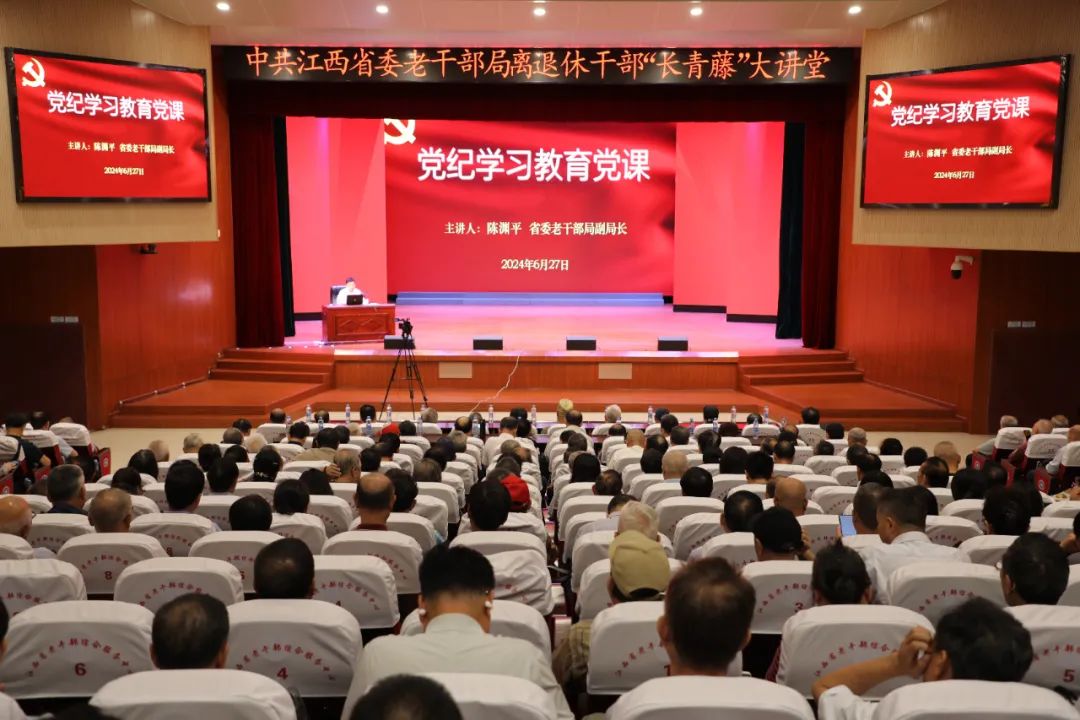 为认真贯彻落实党中央关于在全党开展党纪学习教育的部署和省委工作要求,积极推动全省离退休干部开展党纪学习教育,6月27日,省委老干部局在南昌举办全省离退休干部“长青藤”大讲堂,省委老干部局副局长陈渊平同志为老干部讲专题党课,beat365离退休老干部张步平、辛筱萍同志参加。