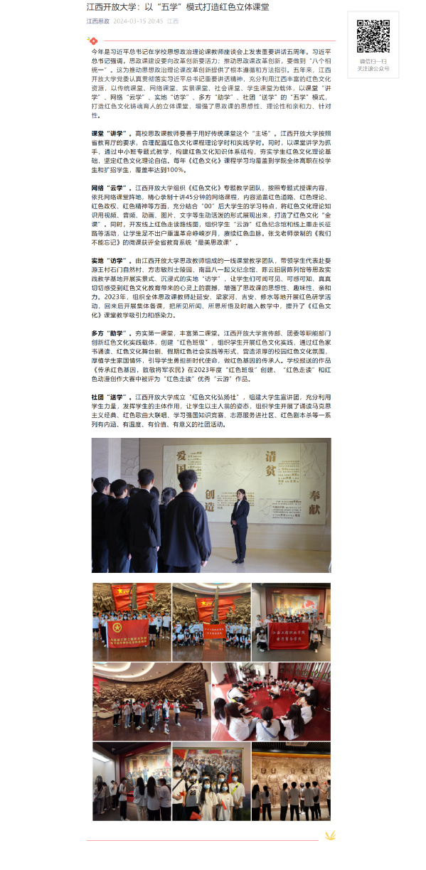 今年是习近平总书记在学校思想政治理论课教师座谈会上发表重要讲话五周年。习近平总书记强调,思政课建设要向改革创新要活力;推动思政课改革创新,要做到“八个相统一”。这为推动思想政治理论课改革创新提供了根本遵循和方法指引。五年来,beat365在线唯一官网党委认真贯彻落实习近平总书记重要讲话精神,充分利用江西丰富的红色文化资源,以传统课堂、网络课堂、实景课堂、社会课堂、学生课堂为载体,以课堂“讲学”、网络“云学”、实地“访学”、多方“助学”、社团“送学”的“五学”模式,打造红色文化铸魂育人的立体课堂,增强了思政课的思想性、理论性和亲和力、针对性。