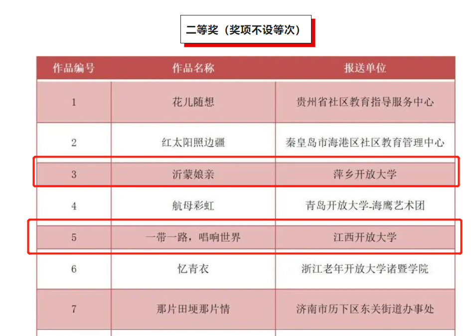为献礼党的二十大,配合做好国家老年大学开学季活动,根据国家开放大学关于开展“献礼二十大 同唱欢乐歌”“献礼二十大 共跳幸福舞”线上展播活动的有关通知,学校精心组织学员团体录制了2个合唱作品和2个舞蹈作品,其中舞蹈作品《一带一路,唱响世界》荣获二等奖,合唱作品《母亲是中华》荣获三等奖。此外,经学校审核推荐的萍乡开放大学选送的舞蹈作品《沂蒙娘亲》也荣获二等奖。