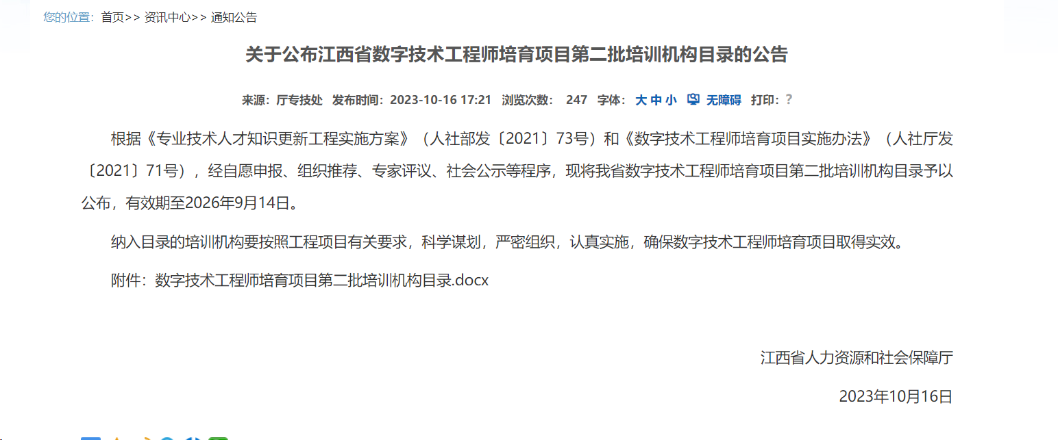 近日,江西省人力资源和社会保障厅公布了江西省数字技术工程师培育项目第二批培训机构目录,beat365社会教育学院联合智能技术学院申报的人工智能工程技术人员培育项目培训机构成功获评。
