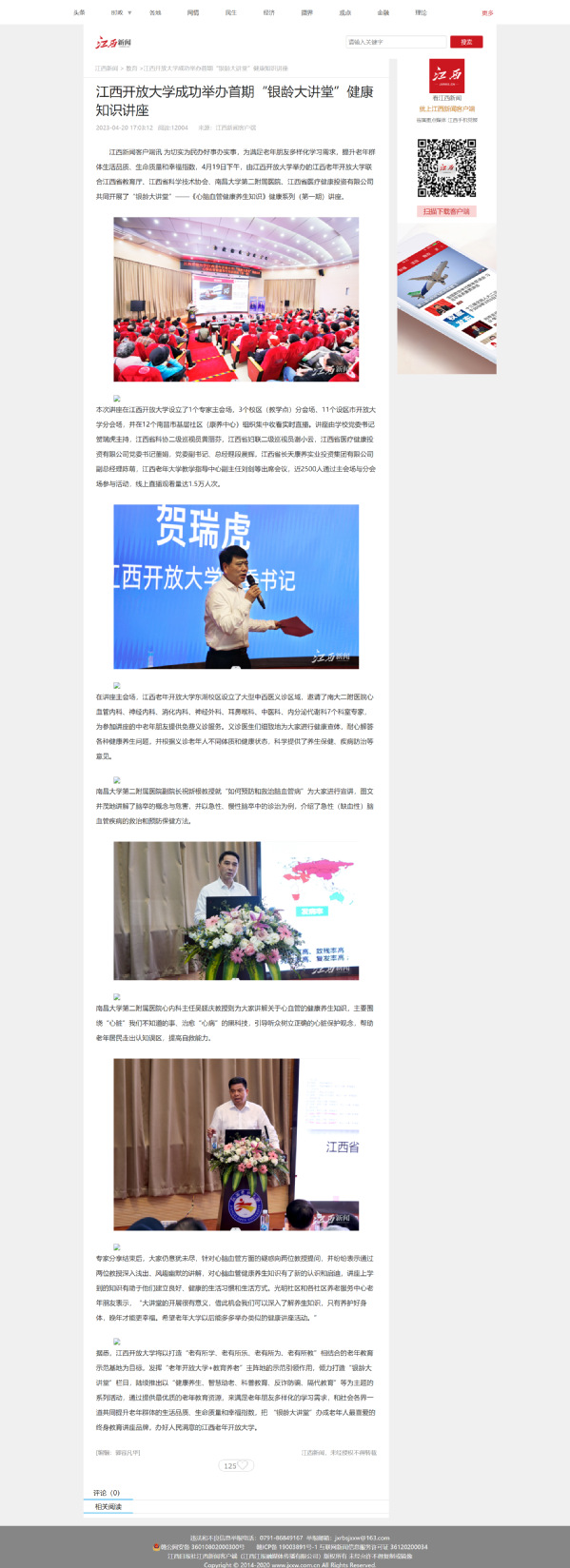江西新闻客户端讯 为切实为民办好事办实事,为满足老年朋友多样化学习需求,提升老年群体生活品质、生命质量和幸福指数,4月19日下午,由beat365在线唯一官网举办的江西老年开放大学联合江西省教育厅、江西省科学技术协会、南昌大学第二附属医院、江西省医疗健康投资有限公司共同开展了“银龄大讲堂”——《心脑血管健康养生知识》健康系列(第一期)讲座。