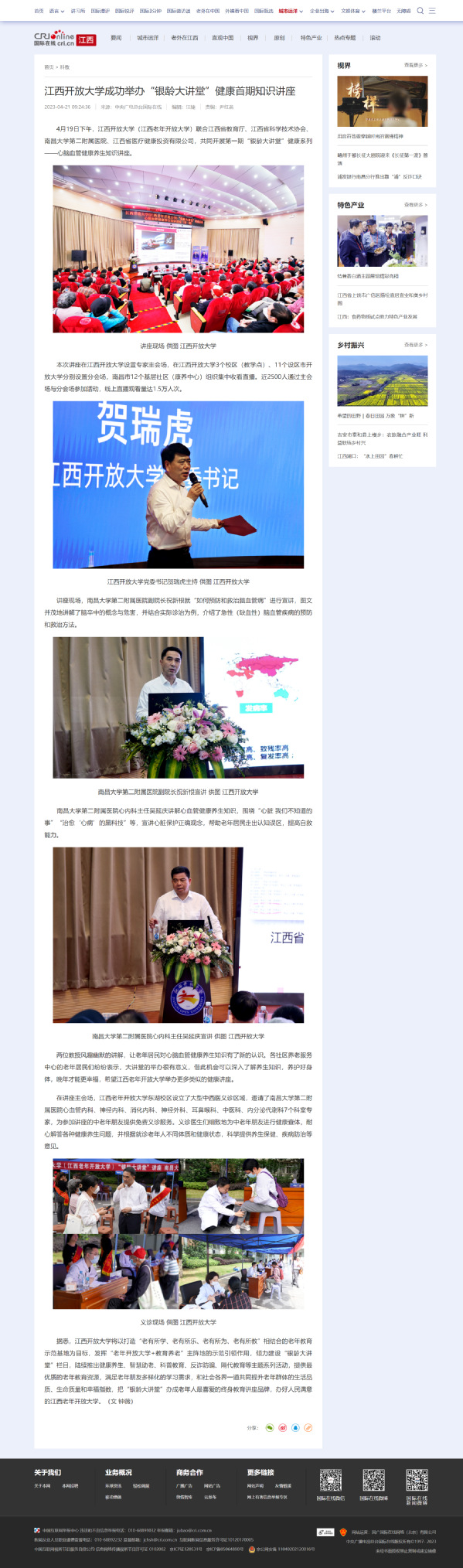4月19日下午,beat365在线唯一官网(江西老年开放大学)联合江西省教育厅、江西省科学技术协会、南昌大学第二附属医院、江西省医疗健康投资有限公司,共同开展第一期“银龄大讲堂”健康系列——心脑血管健康养生知识讲座。