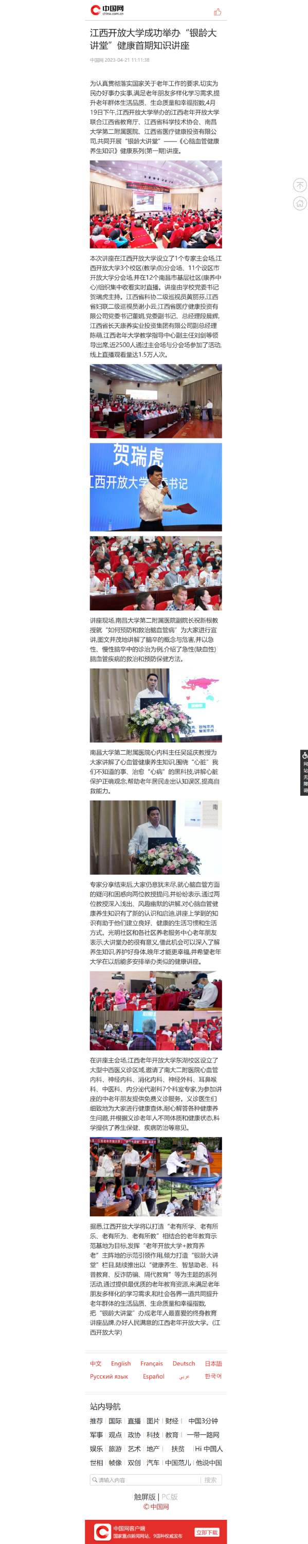为认真贯彻落实国家关于老年工作的要求,切实为民办好事办实事,满足老年朋友多样化学习需求,提升老年群体生活品质、生命质量和幸福指数,4月19日下午,beat365在线唯一官网举办的江西老年开放大学联合江西省教育厅、江西省科学技术协会、南昌大学第二附属医院、江西省医疗健康投资有限公司,共同开展“银龄大讲堂”——《心脑血管健康养生知识》健康系列(第一期)讲座。