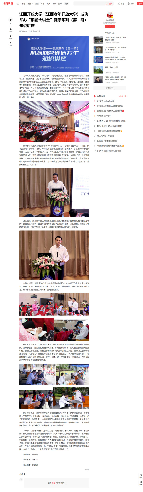 为深入贯彻落实党的二十大精神,认真贯彻落实习近平总书记关于老龄工作和教育工作的重要论述,落实积极应对人口老龄化国家战略,扎实开展好学习贯彻习近平新时代中国特色社会主义思想主题教育,践行“学思想、强党性、重实践、建新功”的总要求,切实为民办好事办实事,满足老年朋友多样化学习需求,提升老年群体生活品质、生命质量和幸福指数,419日下午,beat365在线唯一官网(江西老年开放大学)联合江西省教育厅、江西省科学技术协会、南昌大学第二附属医院、江西省医疗健康投资有限公司,共同开展“银龄大讲堂”——《心脑血管健康养生知识》健康系列(第一期)讲座。