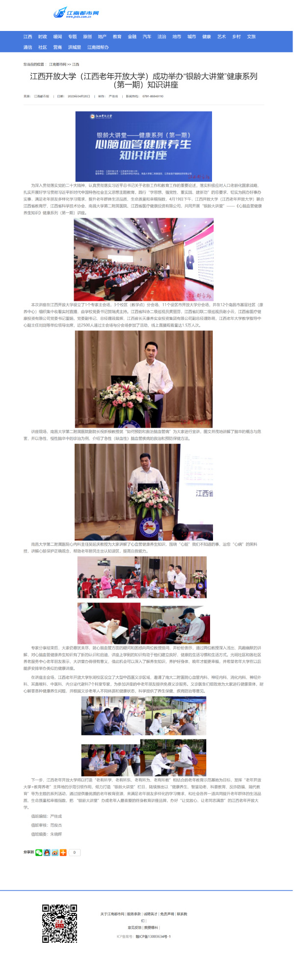 为深入贯彻落实党的二十大精神,认真贯彻落实习近平总书记关于老龄工作和教育工作的重要论述,落实积极应对人口老龄化国家战略,扎实开展好学习贯彻习近平新时代中国特色社会主义思想主题教育,践行“学思想、强党性、重实践、建新功”的总要求,切实为民办好事办实事,满足老年朋友多样化学习需求,提升老年群体生活品质、生命质量和幸福指数,4月19日下午,beat365在线唯一官网(江西老年开放大学)联合江西省教育厅、江西省科学技术协会、南昌大学第二附属医院、江西省医疗健康投资有限公司,共同开展“银龄大讲堂”——《心脑血管健康养生知识》健康系列(第一期)讲座。