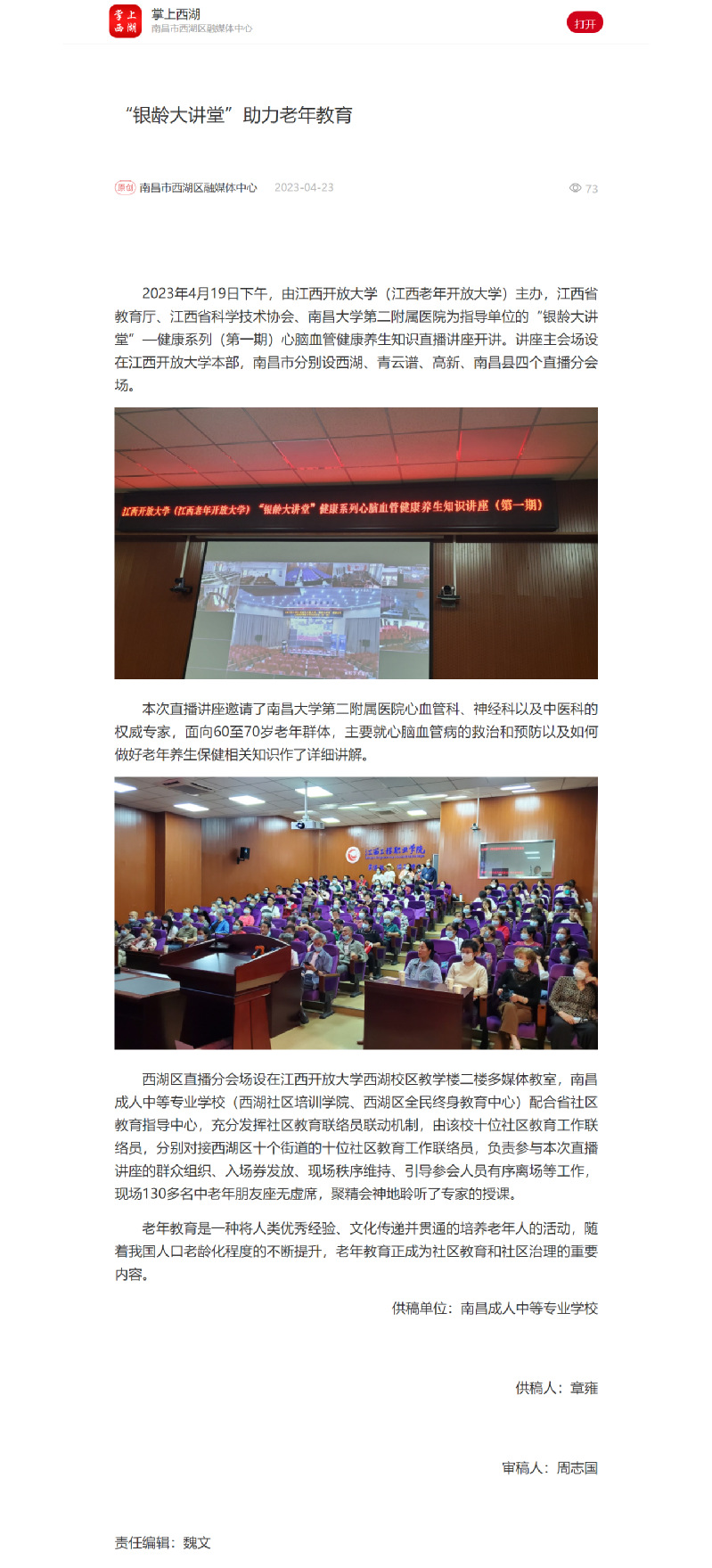 2023年4月19日下午,由beat365在线唯一官网(江西老年开放大学)主办,江西省教育厅、江西省科学技术协会、南昌大学第二附属医院为指导单位的“银龄大讲堂”—健康系列(第一期)心脑血管健康养生知识直播讲座开讲。讲座主会场设在beat365在线唯一官网本部,南昌市分别设西湖、青云谱、高新、南昌县四个直播分会场。