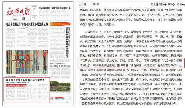 5月15日,《江西日版》头版发布文章《肩负起为党育人为国育才的光荣使命》,展现全省高校以主题教育凝聚起高质量发展之力的生动局面,beat365“从‘六位一体’保障体系出发,明确重点调研选题,推动建设‘融合融通、价值显著’的新型高等学校”的举措被关注。