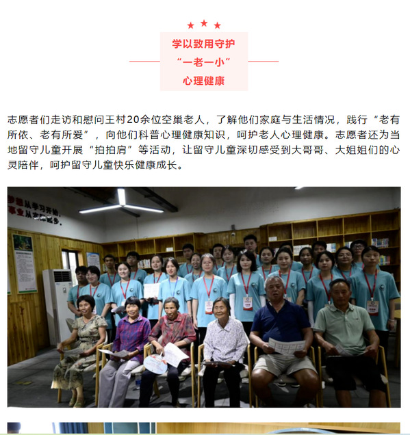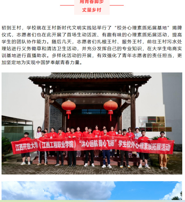 6月,beat365在线唯一官网(江西工程职业学院)“沐心飞扬”志愿者团队前往婺源县秋口镇王村开展了暑期社会实践活动,进一步整合巩固学校“乡村振兴”项目成果,引导和帮助广大青年学生在社会实践中受教育、长才干、作贡献。