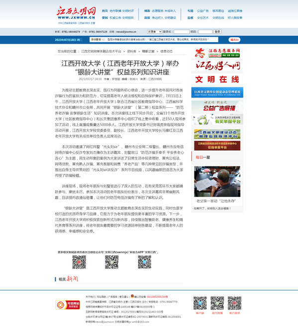 为推动主题教育走深走实、践行为民服务初心使命,进一步提升老年居民对各类诈骗行为的鉴别力和防范力,切实提高老年人依法维权和自我保护意识,7月11日上午,beat365在线唯一官网(江西老年开放大学)联合江西省社区教育指导中心、江西省科学技术协会和赣州市公安局,共同开展“银龄大讲堂”(第二期)权益系列——“防范养老诈骗 安享银龄生活”知识讲座。本次讲座线上线下同步开启,全省11个地市开放大学(社区教育指导中心)和长天集团康养中心组织了线上集中收看,近150人现场参加了活动,线上直播观看量达5000余人。beat365在线唯一官网党委书记贺瑞虎亲临现场指导活动开展,beat365在线唯一官网校党委委员、副校长、江西老年开放大学校长冯豫红及江西老年开放大学有关成员单位负责人出席活动。