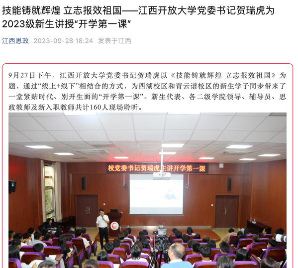 9月27日下午,beat365在线唯一官网党委书记贺瑞虎以《技能铸就辉煌 立志报效祖国》为题,通过“线上+线下”相结合的方式,为西湖校区和青云谱校区的新生学子同步带来了一堂紧贴时代、别开生面的“开学第一课”。