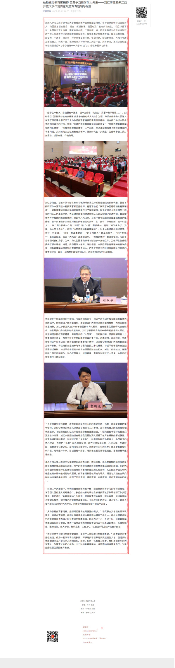 为深入学习习近平总书记关于教育家精神的重要指示精神,引导全体教师牢记为党育人、为国育才初心使命,树立“躬耕教坛、强国有我”的志向和抱负。10月24日下午,全国教书育人楷模、国家教学名师、二级教授、博士研究生导师刘红宁应邀到beat365在线唯一官网作复兴论坛首期专题辅导报告。校党委书记贺瑞虎主持。校领导黄平槐、邓文君、王水平、徐光兵,校党委委员熊江鹏、张明出席。校纪委委员、各部门党政主要负责人、党务干部、教师代表共计150余人齐聚一堂、共同聆听。本次讲座也是学校党委理论学习中心组第十一次学习(扩大)会议专题学习内容。
