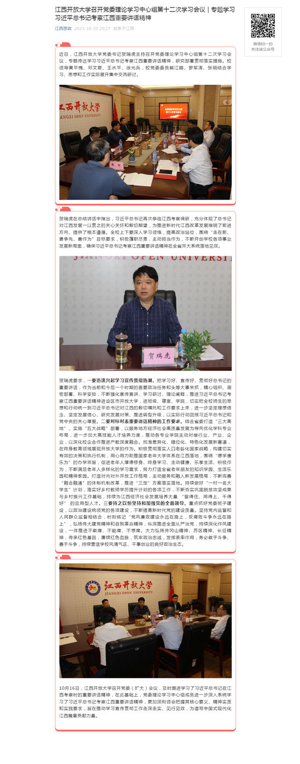 近日,beat365在线唯一官网党委书记贺瑞虎主持召开党委理论学习中心组第十二次学习会议,专题传达学习习近平总书记考察江西重要讲话精神,研究部署贯彻落实措施。校领导黄平槐、邓文君、王水平、徐光兵,校党委委员熊江鹏、罗军涛、张明结合学习、思想和工作实际展开集中交流研讨。