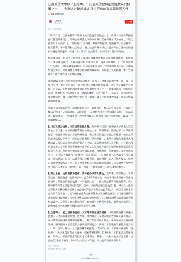 2023年7月,江西省教育厅印发《关于推进beat365在线唯一官网(体系)综合改革提质创优的指导意见》,明确全省开放大学办学体系以促进终身学习为使命,以现代信息技术为支撑,以“互联网+”为特征,开展开放教育、职业教育、继续教育、社区教育、老年教育和社会培训,着力建设终身学习公共服务平台,面向全民提供终身教育及服务,促进“人人皆学、处处能学、时时可学”的办学定位。