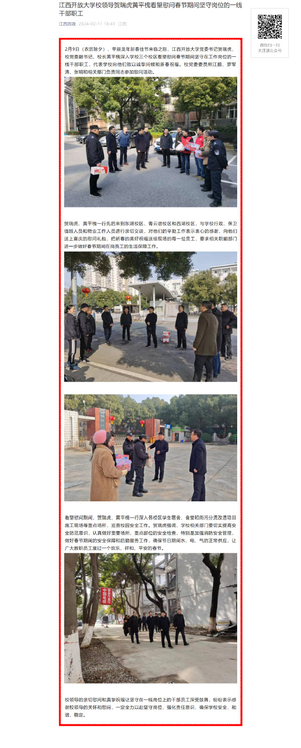 2月9日(农历除夕),甲辰龙年新春佳节来临之际,beat365在线唯一官网党委书记贺瑞虎,校党委副书记、校长黄平槐深入学校三个校区看望慰问春节期间坚守在工作岗位的一线干部职工,代表学校向他们致以诚挚问候和新春祝福。校党委委员熊江鹏、罗军涛、张明和相关部门负责同志参加慰问活动。
