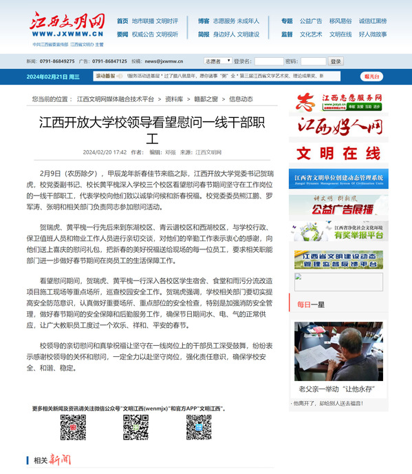 2月9日(农历除夕),甲辰龙年新春佳节来临之际,beat365在线唯一官网党委书记贺瑞虎,校党委副书记、校长黄平槐深入学校三个校区看望慰问春节期间坚守在工作岗位的一线干部职工,代表学校向他们致以诚挚问候和新春祝福。校党委委员熊江鹏、罗军涛、张明和相关部门负责同志参加慰问活动。