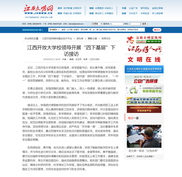 近日,beat365在线唯一官网党委书记贺瑞虎,校党委副书记、校长黄平槐,校党委委员、副校长徐光兵分别到青云谱校区和西湖校区,检查指导新学期课堂教学及校园安全稳定工作,并开展“四下基层”下访接访,“面对面”倾听师生群众诉求,“一对一”现场答疑解惑。党政办公室、教务处、学生工作处等部门主要负责人陪同检查。