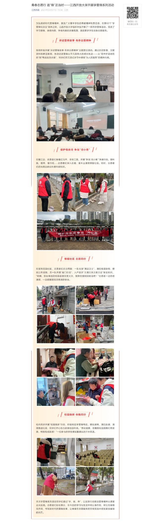 为弘扬新时代雷锋精神,激发广大青年学生的奉献精神和责任感,在第62个“学雷锋纪念日”到来之际,beat365在线唯一官网组织学生开展了一系列学雷锋活动,营造了学习雷锋、崇德向善、争做先锋的浓厚氛围,激励更多学生投身志愿服务。原文地址:https://mp.weixin.qq.com/s?__biz=MzI1OTM4MDMzMA==&mid=2247609165&idx=6&sn=3b05f551b62a373a327b0b6110b9cf7c&chksm=eb33d19d9d41148b8e7c59669604c7754c5d3cc911ee3ee0d3e8694eea0e3811052b2e34bf23&mpshare=1&scene=1&srcid=0309jBCDyaSReW3e0q3iaskX&sharer_shareinfo=97334ef659e0f4b58c8824c3d57085c6&sharer_shareinfo_first=97334ef659e0f4b58c8824c3d57085c6&exportkey=n_ChQIAhIQm7gVmI2hWUO6vd%2BePO%2F3AxL1AQIE97dBBAEAAAAAAHbnFhBfPTcAAAAOpnltbLcz9gKNyK89dVj0jjH8TjEbNDfzydhu9W76IRdqs%2FY7YZOqiHm2wcEK0ygeFQbwwn9wZVZr38jnvj3F2pMI9RgeTqGtXjBUbZcMOL6f5PnhOt6IcGL1cj7mSOHen2RmWpQOBo8rKrpaUmgWpGQc7Plgt7Wy9WuG8zDxA9Nu19o5RQ8cjD1tca5%2FscVVPmFKaqNfXK5DQ%2BkCLkzDqvb%2FJryf%2FULY1jg203oovHNK9Z%2FrUIH2g%2BG3pfeSE%2B7jLt8QYrcPaHb9FWi26T2cOLlkfCQoXV4zfYs5Xmrt&acctmode=0&pass_ticket=jRO6fsgTxf3UgfsJ0%2FZOy3yCOYgzKwQKkz2f3sUT29hv1dGpDeKu%2BD6qt0OG7ixL&wx_header=0#rd (责任编辑:罗楚颖)