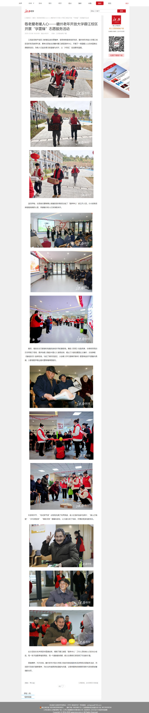 为积极弘扬志愿精神,倡导尊老敬老良好风尚,赣州老年开放大学蓉江校区组织党员教师代表、青年志愿者走进赣州蓉江新区颐养中心,开展了一场温暖人心的学雷锋志愿服务活动,为老人们送去春日的温暖与关怀,让“夕阳红”生活更有温度。