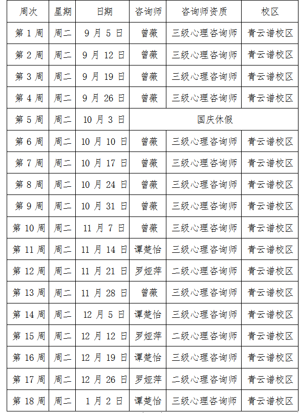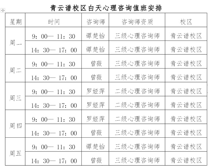 青云谱校区夜间心理咨询值班安排(时间:18:30-20:30)