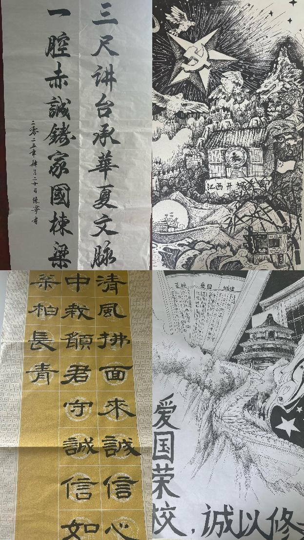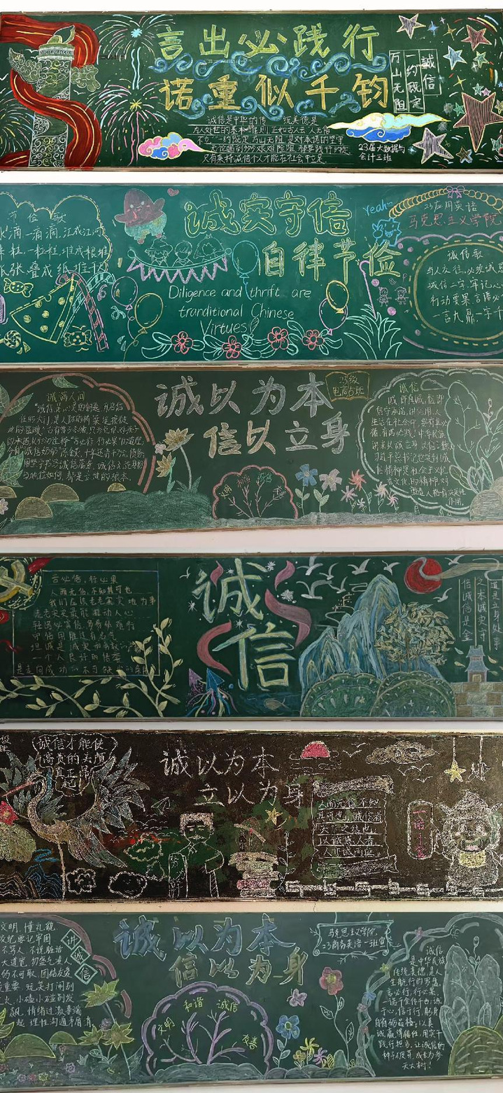 在以“爱国荣校,诚信为本”主题书画、黑板报比赛中,同学们积极参赛,热情创作,一张张精美雅致的书画作品、一幅幅意义深刻的黑板报,诠释了同学们的爱国情怀与诚信理念。