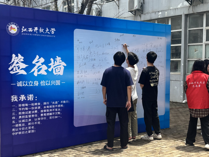 4月25日中午,学校在西湖校区一食堂门口组织开展了“诚以修身,俭以兴国”主题签名墙活动。签名活动吸引了众多师生的热情参与,大家手中的笔在签名墙上留下了遒劲有力的字迹,代表着江开师生对厉行节约,讲求诚信的郑重承诺。签名墙上的字迹越来越多,汇聚成一股强大的力量,激励着学生们在今后的学习和生活中时刻践行节约、诚信理念。